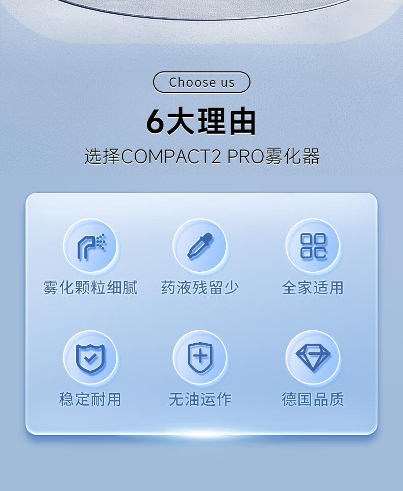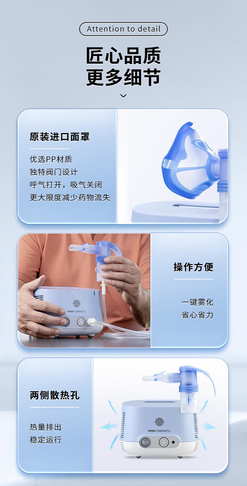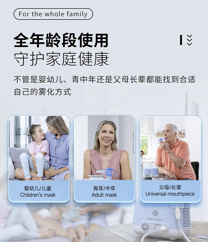 PARI COMPACT2 Pro 可用于治疗慢性呼吸道疾病,如支气管扩张、支气管炎和慢性阻塞性肺疾病。